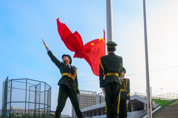 国旗护卫队成员身着笔挺的制服,步伐坚定而统一,护送国旗至升旗台前。在雄壮的国歌声中,五星红旗缓缓升起,迎风飘扬。