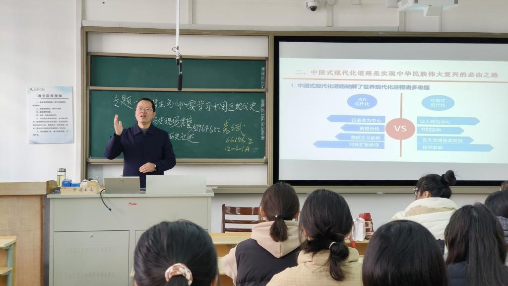 校领导带头走进课堂、站上讲台,瞻国际形势,析国内大势,结合习近平总书记的“开局之年第一课”和省、市当下发展与未来愿景,生动、深入讲述中国式现代化的中国特色、核心要义和重大意义等。“老师在课堂上列举的土耳其地震、非洲新冠等案例让我印象深刻、提神醒脑,也让我更加深刻地意识到,国家的强大是多么重要。作为当代中国青年,要勇敢地肩负起建设社会主义现代化强国应有的使命担当。”学生胡羽澄课后说道。