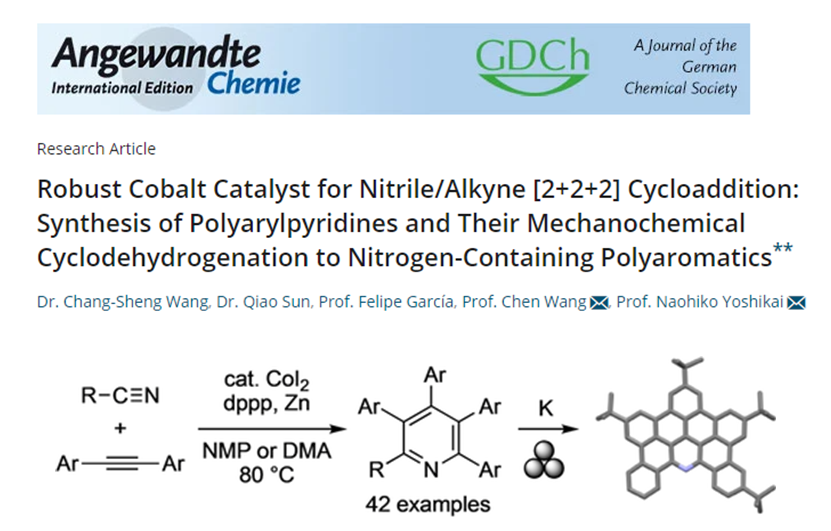 2021年2月,研究团队在Angewandte Chemie International Edition杂志上发表了题为《Robust Cobalt Catalyst for Nitrile/Alkyne [2+2+2] Cycloaddition: Synthesis of Polyarylpyridines and Their Mechanochemical Cyclodehydrogenation to Nitrogen-Containing Polyaromatics》的文章,发展了一种基于碘化钴(II),1,3-双(二苯基膦基)丙烷和锌的简单廉价的催化体系,可促进各种腈和二芳基乙炔的[2+2+2]环加成反应,从而合成一系列多芳基吡啶。DFT机理研究表明反应依次经历两个炔烃氧化偶联、腈插入钴环戊二烯中间体和C‐N还原消除。反应获得的四芳基和五芳基吡啶通过机械化学辅助的还原性脱氢环化,可以合成全新的含氮多环芳烃。
