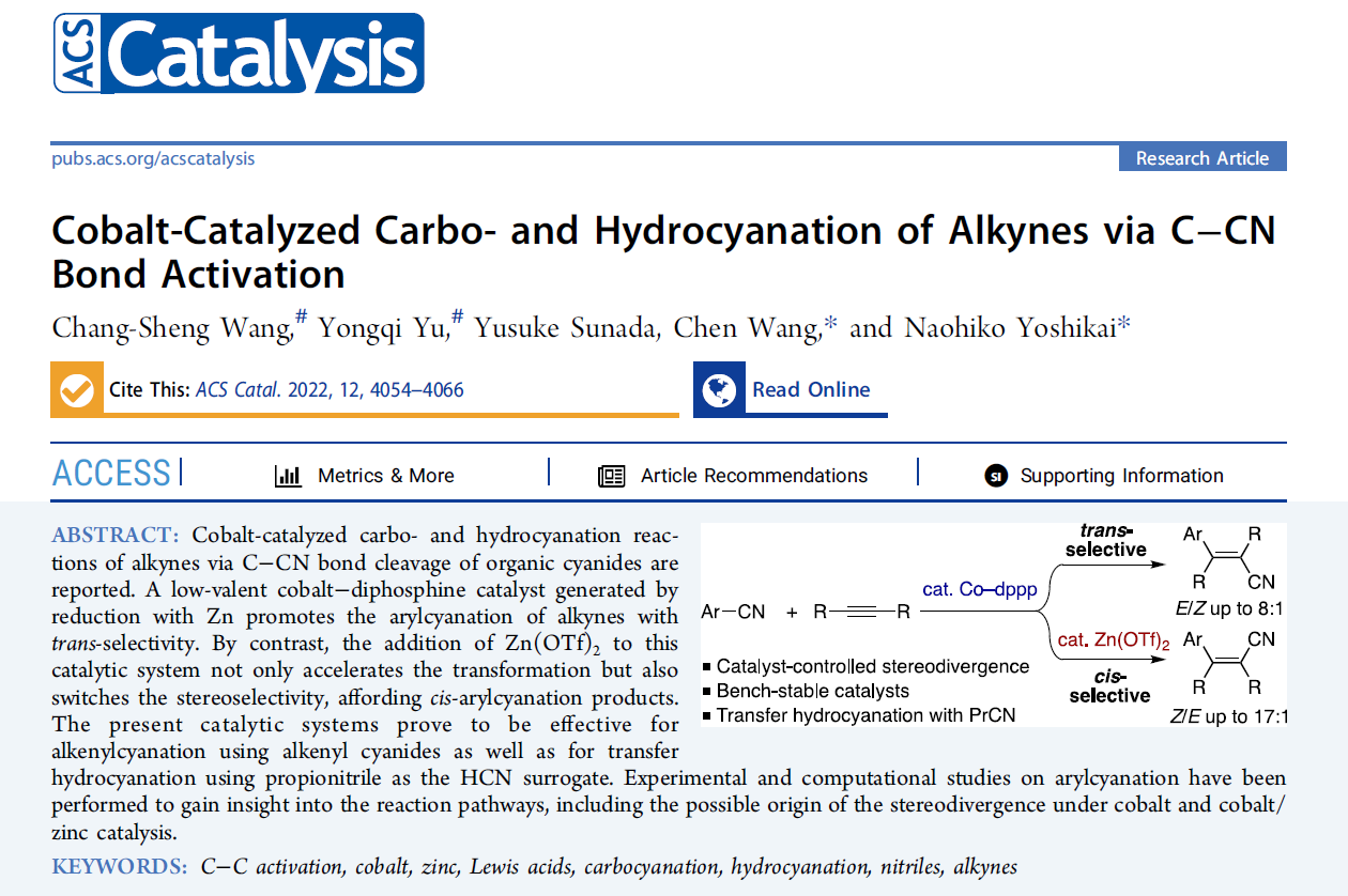 2022年3月,研究团队在ACS catalysis杂志上发表了题为《Cobalt-Catalyzed Carbo- and Hydrocyanation of Alkynes via C−CN Bond Activation》的文章,发展了钴催化的通过有机氰化物的 C-CN 键断裂发生的炔烃的碳氰基化和氢氰基化反应。研究发现,通过用 Zn 还原生成的低价钴-二膦催化剂可以实现反式选择性的炔烃的芳基氰基化。相比之下,向该催化体系中添加 Zn(OTf) 2不仅可以加速转化,而且改变了立体选择性,最后得到顺式的芳基氰化产物。该催化体系对于使用烯基氰化物的烯基氰化以及使用丙腈作为 HCN 替代物的转移氢氰基化都非常行之有效。机理实验揭示了生成活性钴催化剂的长诱导期、立体选择性的动力学控制以及芳基-CN键活化步骤的性质。DFT计算对芳基氰化的机理研究表明,反应历程包含了芳基−CN的氧化加成、炔烃插入Co−芳基键和烯基−CN还原消除。其中烯基(氰基)钴中间体的顺式/反式异构化可能先于还原消除发生。在Co-dppp体系中,顺式/反式异构化较容易发生,和顺式和反式产物的还原消除途径相互竞争。而Zn(OTf)2的加入则可以通过稳定过渡态降低C−CN还原消除的活化能,从而使顺式芳基氰化途径更加有利。