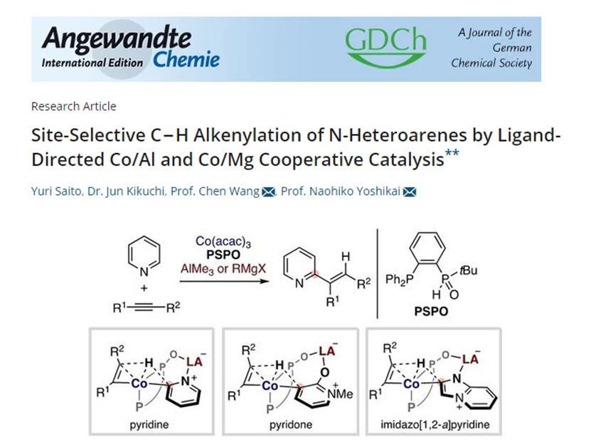 2023年3月,研究团队在Angewandte Chemie International Edition杂志上发表了题为《Site-Selective C−H Alkenylation of N-Heteroarenes by Ligand-Directed Co/Al and Co/Mg Cooperative Catalysis》的文章,发展了使用Co/Al和Co/Mg双金属催化剂和膦/仲氧化膦双功能配体(PSPO),催化 N-杂芳烃与炔烃的位点选择性 C-H 烯基化反应。吡啶、吡啶酮和咪唑并 [1,2- a ]吡啶在靠近路易斯碱性氮或氧的C-H位点都能被有效地烯基化。DFT计算表明C-H活化历程是配体到配体氢转移 (ligand-to-ligand hydrogen transfer, LLHT)。