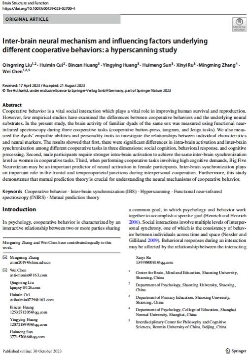 近日,我校大脑、心智与教育研究中心陈巍教授团队在著名神经解剖学领域期刊Brain Structure and Function(SCIJCR Q1, IF=3.1)发表题为“Inter-brain neural mechanism and influencing factors underlying different cooperative behaviors: a hyperscanning study”的学术成果(文章链接https://doi.org/10.1007/s00429-023-02700-4)。该研究是我校首个文科实验室“大脑、心智与教育研究中心”大脑功能性近红外设备(functional near-infraredspectroscopy, fNIRS)投入使用后的一项成果。