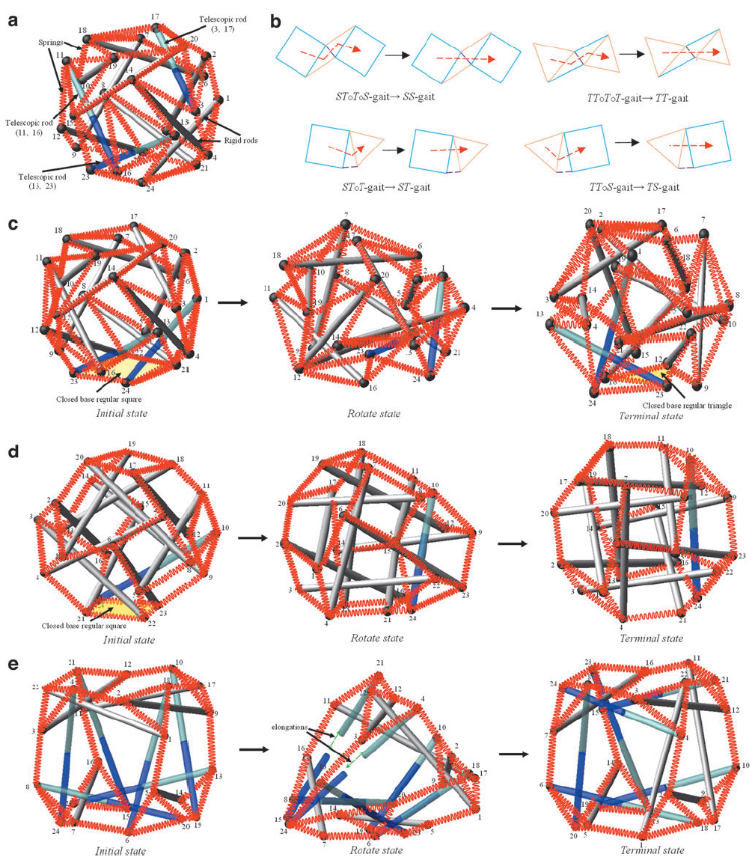 现有的球形张拉整体机器人几乎均为单步态运动模式,从而导致其在对未知复杂环境进行探索时存在步态单一、路径空间盲区大、行进效率低等缺陷。为此,研究团队开发了三个具有多步态特征的12杆张拉整体机器人原型并对其各自的独立(或进化)步态模式进行了动态模拟和验证,并结合步态驱动量、路径盲区大小和行进跨度等参数指标评估三种12杆张拉整体机器人与经典的6杆张拉整体机器人在运动学步态模式的可行性和适用性,从而筛选出最优者。